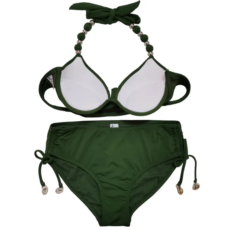 Conjunto de biquíni feminino com alças ajustáveis e detalhes em miçangas, oferecendo sustentação, modelagem elegante e conforto para o verão.