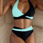 Top halter com bojo, recortes em patchwork; calcinha cintura alta para melhor ajuste e valorização do corpo.