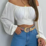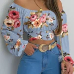 Blusa feminina elegante com caimento slim, estampa moderna e design ombro a ombro, perfeita para compor looks casuais sofisticados.
