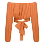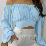 Modelo curto com mangas longas estilo lanterna, detalhe em laço frontal e acabamento refinado. Ideal para moda urbana e combinações versáteis.