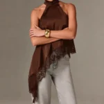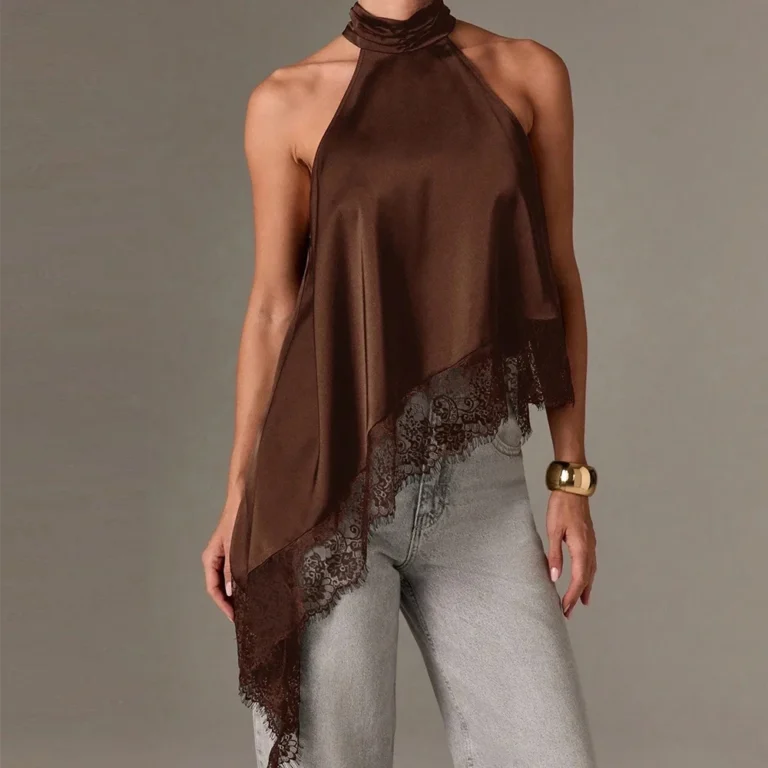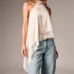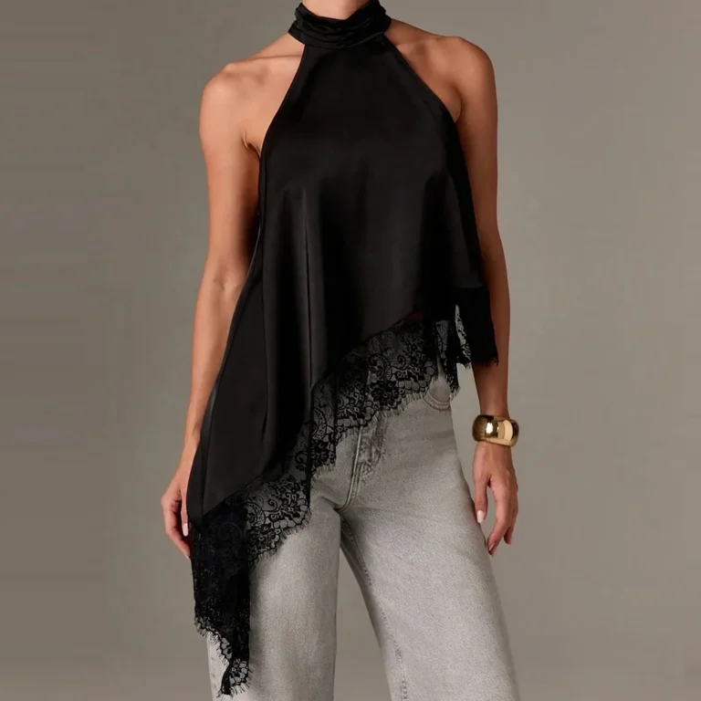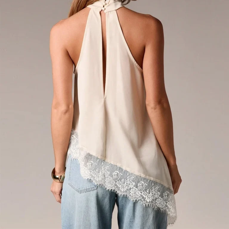 Blusa com gola halter e design de costas abertas, desenvolvido no estilo Y2K. A peça apresenta um caimento fluido com bainha de renda irregular, proporcionando um visual moderno e autêntico. Além disso é confeccionado em poliéster de alta qualidade, o modelo possui acabamento sólido e estrutura sem mangas, ideal para dias quentes.