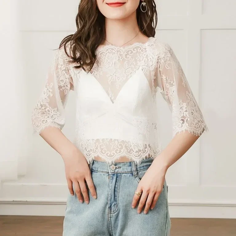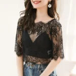 Top feminino em renda floral com efeito transparente, ideal para criar looks modernos e delicados durante a primavera e o verão.