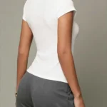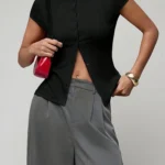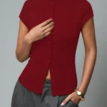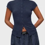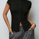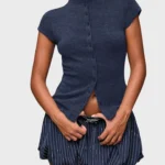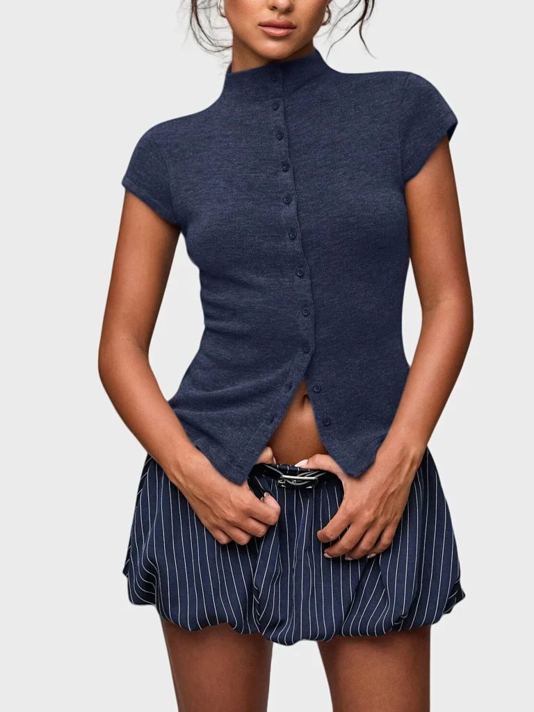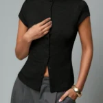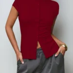Camisa de malha com modelagem fina e gola alta que apresenta design trespassado e fechamento em ponto aberto. Além disso a peça possui mangas curtas normais e comprimento regular com bainha curta na frente e longa atrás. O modelo é confeccionado em tecido de peso pesado com acabamento sólido e botões simétricos decorativos.