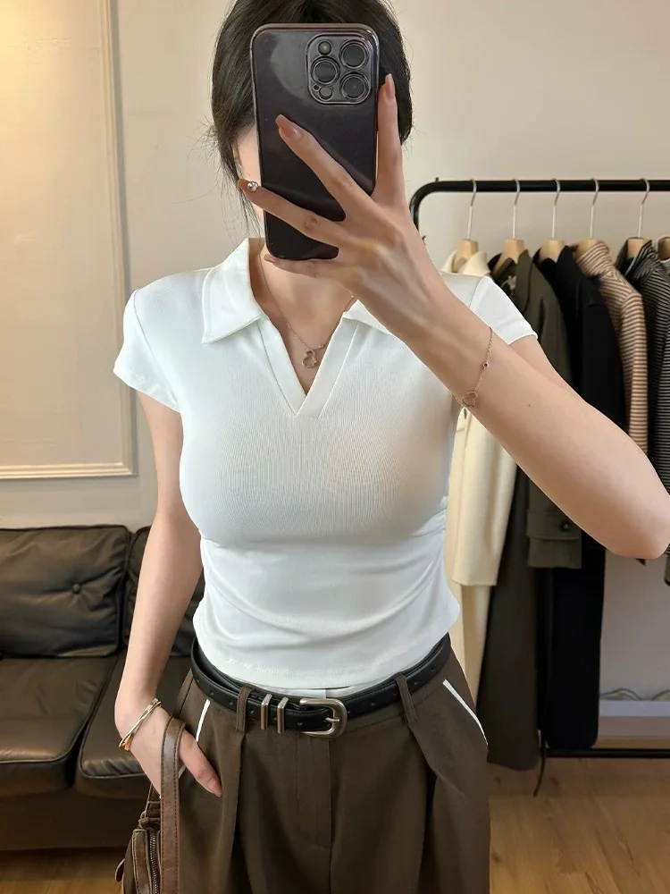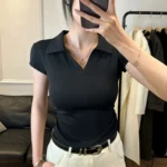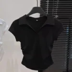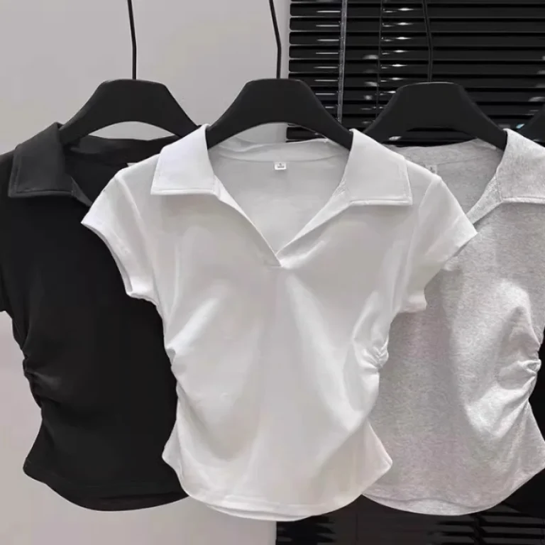 Blusa com visual atual e confortável, confeccionado em algodão com trama em tricô que garante respirabilidade e maciez ao toque. O modelo possui comprimento curto, mangas curtas e colarinho virado para baixo, trazendo um acabamento moderno. O detalhe franzido acrescenta textura ao design, enquanto a elasticidade média proporciona ajuste agradável ao corpo, ideal para os dias de verão.