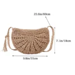 Bolsa feminina em palha com formato meia-lua, estilo boêmio e leve. Ideal para uso diário ou passeios casuais, combinando praticidade e charme natural.