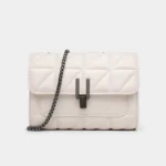 O formato com tampa (flap) aliado à decoração em correntes cria um visual moderno e sofisticado, ideal para quem busca um acessório fashion.