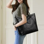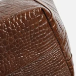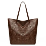 Bolsa tote casual estilo vintage, uma peça versátil com textura padrão jacaré. Com design suave e espaçoso, o seu interior é amplo e sem divisórias, ideal para carregar itens essenciais com praticidade, enquanto o fechamento em zíper garante segurança.