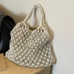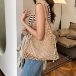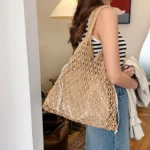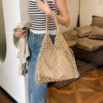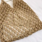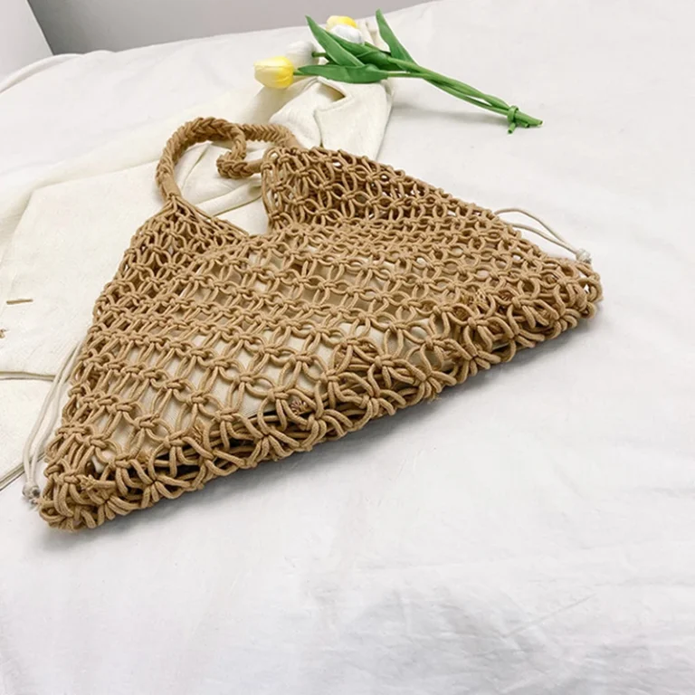 Bolsa sacola de estilo boêmio confeccionada em palha com acabamento em tricô. Além disso a peça apresenta design suave de alça única com fechamento por zíper e forro interno em poliéster