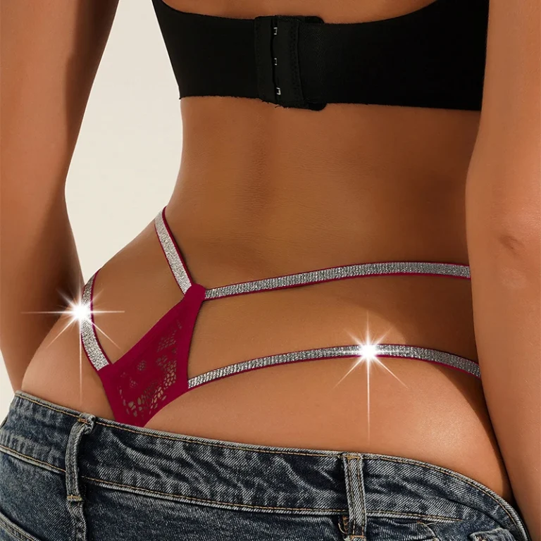 Calcinha G-string de cintura baixa com renda delicada e acabamento em cetim para um visual sexy e elegante.