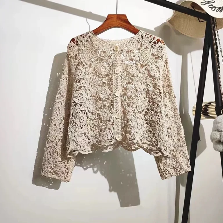 Cardigan feminino em crochê com design boho, ideal para usar sobre biquínis ou como peça leve em dias quentes.