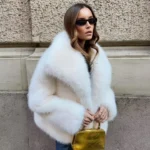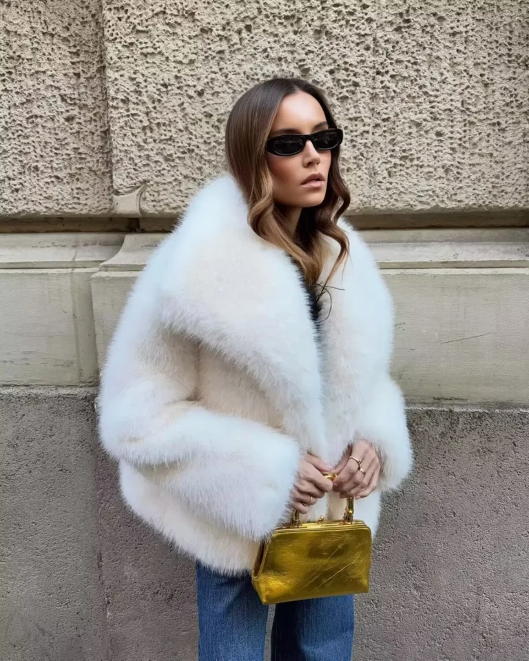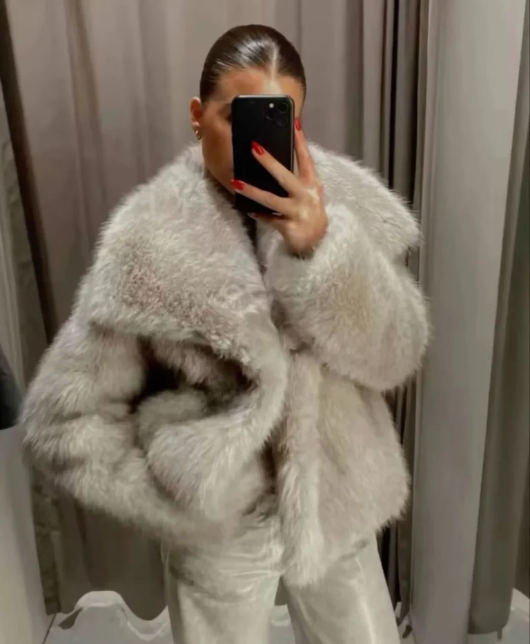 Casaco em pele sintética com visual sofisticado e acabamento clássico, ideal para composições elegantes em dias mais frios. A modelagem de cintura larga proporciona caimento confortável, enquanto o colarinho virado para baixo e o fechamento por botões cobertos reforçam a estética refinada da peça.