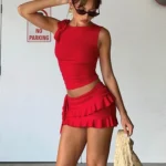 Conjunto de duas peças com blusa curta e saia mini desenvolvido para eventos de lazer. Além disso a peça apresenta silhueta bainha com comprimento acima do joelho e ajuste fino ao corpo com cintura elástica.