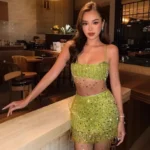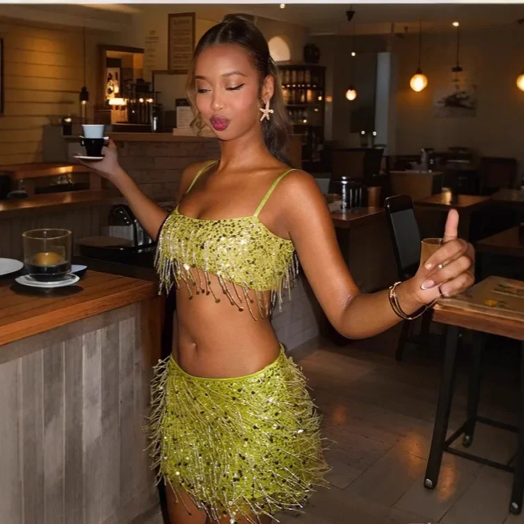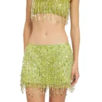 Conjunto de saia e blusa com lantejoulas, uma peça glamourosa desenvolvida para quem busca brilho em festas e eventos noturnos! O modelo conta com detalhes em borlas que conferem movimento e um toque ousado ao visual, com modelagem que valoriza a silhueta, a saia possui comprimento na altura do joelho, equilibrando modernidade e sofisticação de forma versátil.