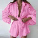 Conjunto casual de algodão e poliéster com modelagem solta, ideal para proporcionar máximo conforto durante as temporadas de primavera e verão. A blusa possui colarinho virado para baixo, mangas longas até o pulso e o shorts acompanha o design descontraído com cintura elástica para um ajuste facilitado e liberdade de movimento, sendo uma peça versátil para o dia a dia.