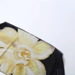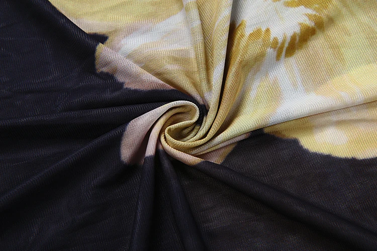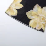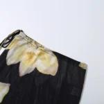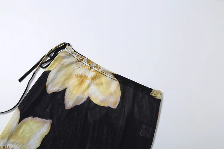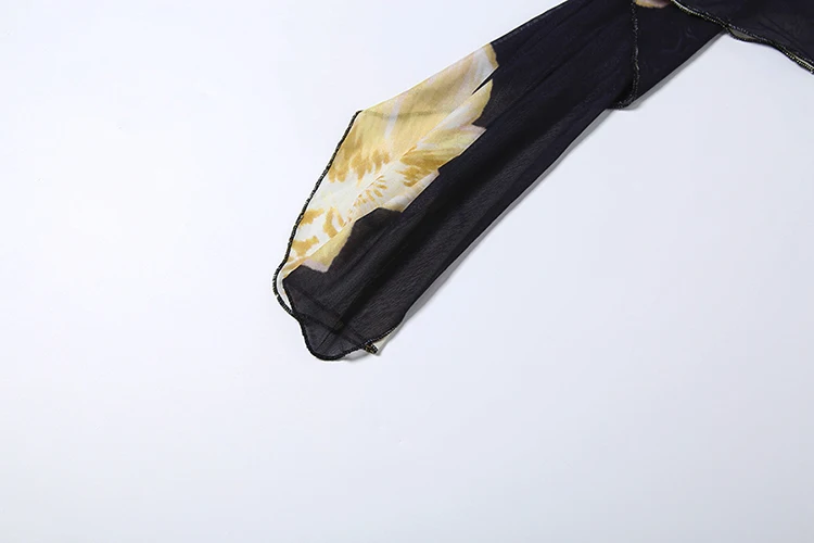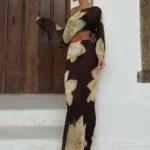 Conjunto de duas peças com estampa floral e colar inclinado. A peça apresenta silhueta bainha com comprimento até o tornozelo, mangas compridas e também possui ajuste fino ao corpo com cintura elástica.