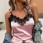 Conjunto de pijama feminino pensado para proporcionar conforto no dia a dia com proposta leve e funcional, com modelagem com shorts e alças finas tipo espaguete que favorecem o frescor. Além disso, possui toque macio e caimento confortável com um padrão listrado para uso em momentos de descanso.