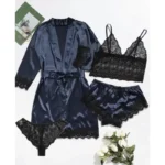 Conjunto de pijama com modelagem leve e confortável, ideal para uso durante o outono. Possui decote em V e mangas três quartos, oferecendo um caimento solto e agradável. Confeccionado em chiffon de poliéster, garante toque macio e sensação suave na pele, sendo uma opção prática para momentos de descanso.
