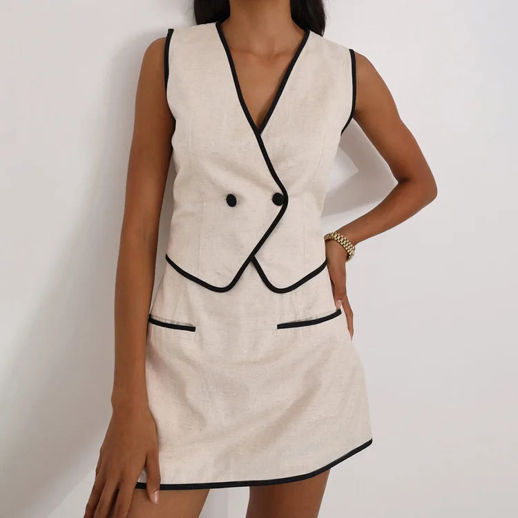 Conjunto de duas peças estilo contemporâneo, composto por um top sem mangas e saia mini de silhueta bainha. A peça apresenta decote em V e detalhes funcionais em zíperes, proporcionando um visual autêntico e moderno para ocasiões especiais ou uso casual. Além disso, com a modelagem solta na parte superior e fechamento prático, o conjunto une conforto e personalidade em um design sólido e minimalista.