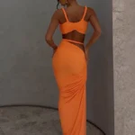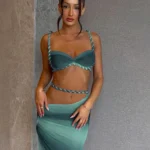 Conjunto de duas peças composto por top curto e saia longa. Além disso a peça é confeccionada em mistura de poliéster e elastano com silhueta bainha e comprimento até o chão.