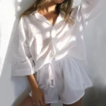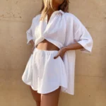 Peça casual com modelagem solta, desenvolvida especialmente para proporcionar conforto e leveza durante a temporada de verão. Confeccionada em fibra sintética de poliéster com técnica de tecelagem tat, a peça apresenta um caimento estruturado e elegante, mantendo sua forma original por ser um material não esticável.
