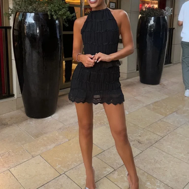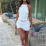 Conjunto de duas peças com saia curta e blusa sem mangas desenvolvido para uso em todas as estações e lazer. A peça apresenta silhueta reta com comprimento até o tornozelo, gola O e o modelo ainda possui ajuste fino ao corpo com cintura elástica e acabamento em padrão sólido.