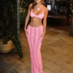 Conjunto de saia longa de silhueta confeccionado em tecido de malha com mistura de elastano e poliéster. Além disso a peça possui comprimento até o chão e ajuste fino ao corpo