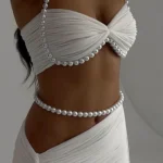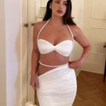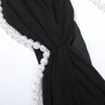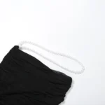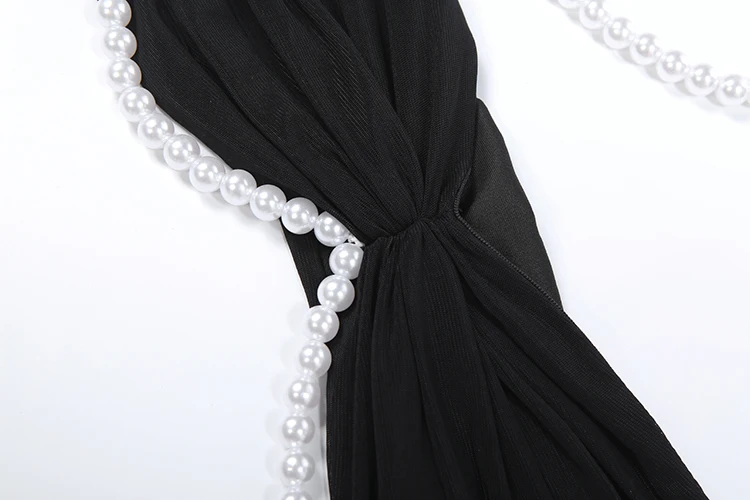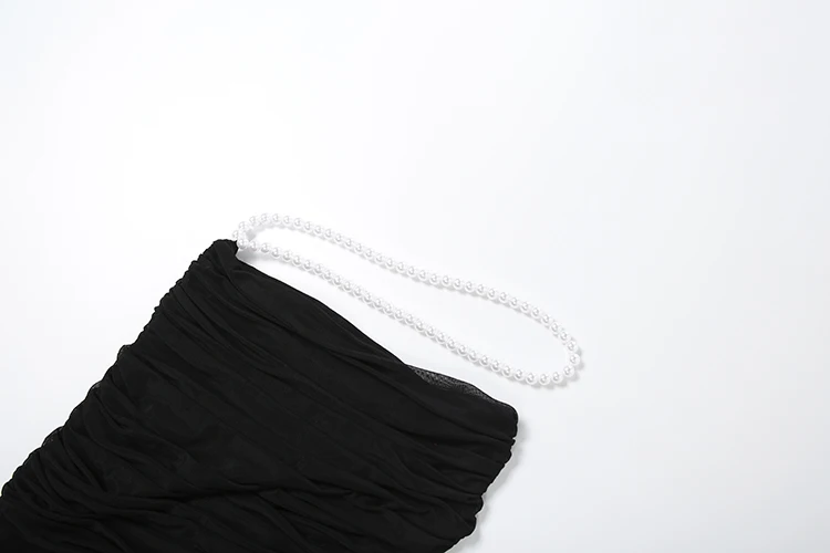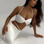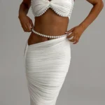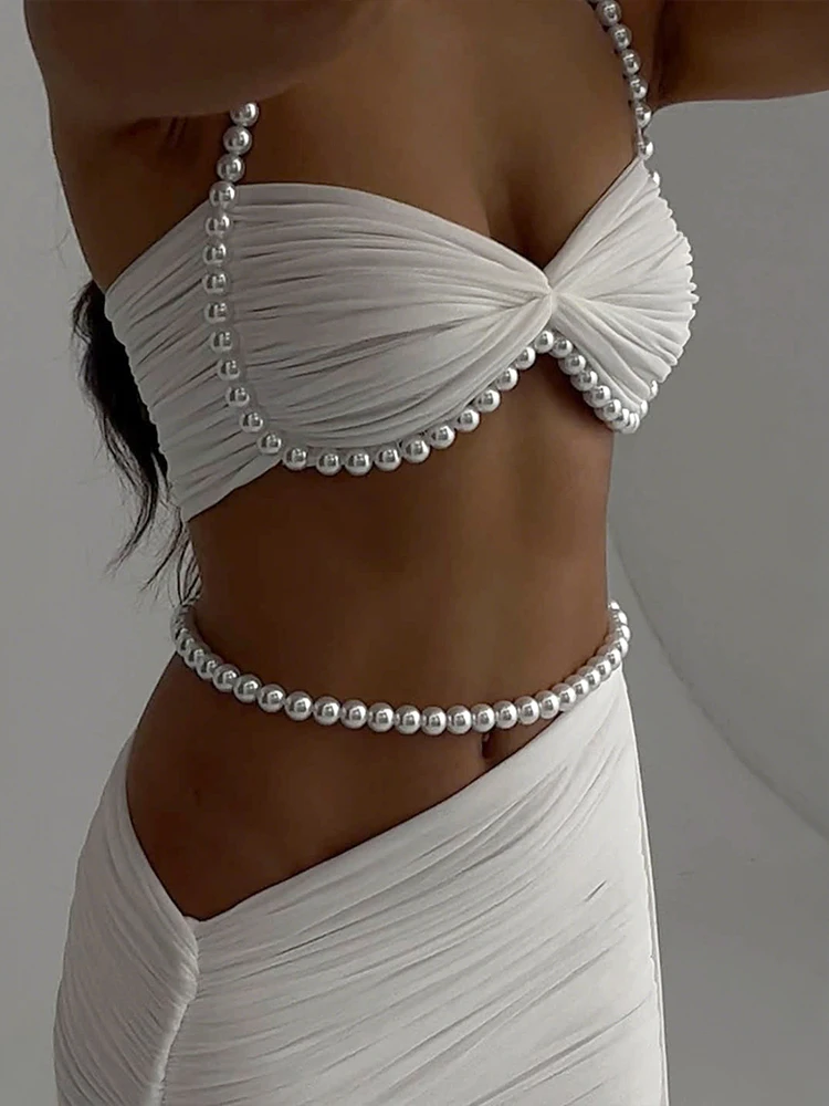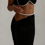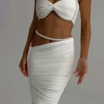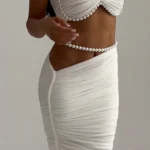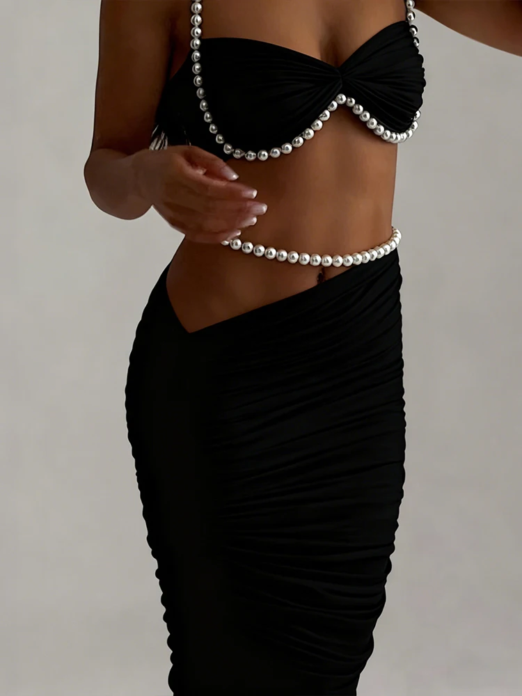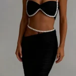 Conjunto de duas peças com silhueta bainha confeccionado em mistura de elastano e poliéster. Além disso a peça apresenta decote e design sem mangas com detalhes decorativos em pérolas.