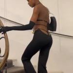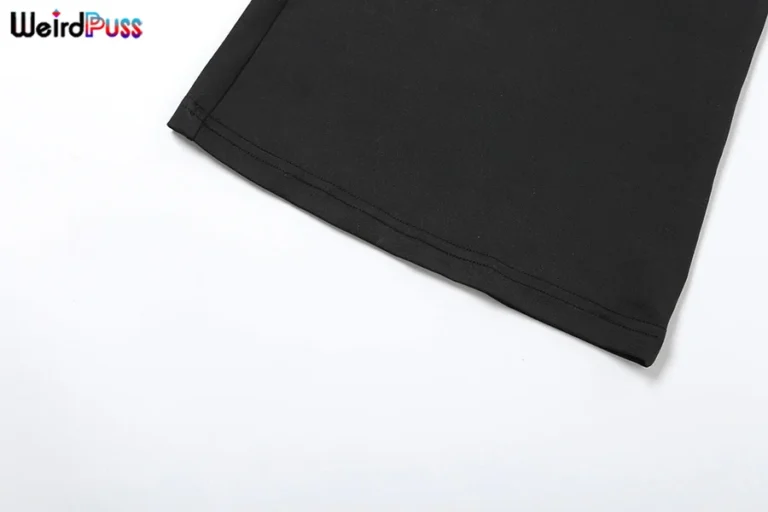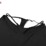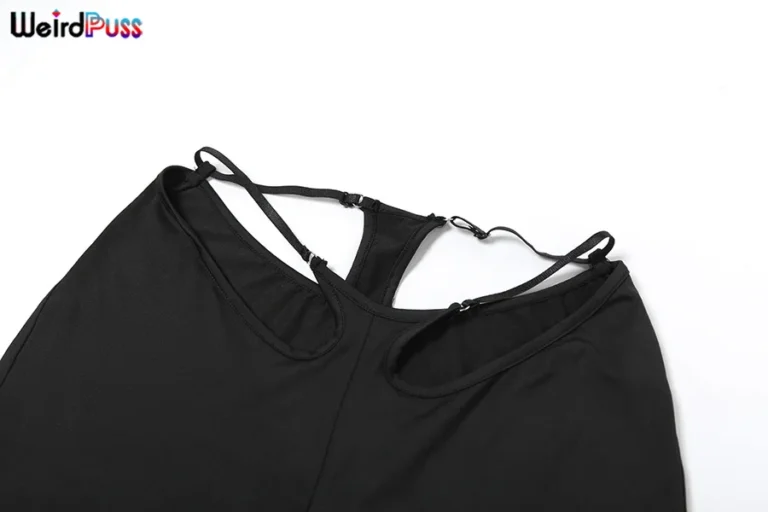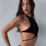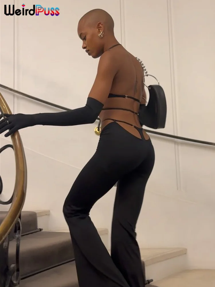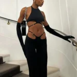 Conjunto composto por top curto e calça flare com modelagem fina e alta elasticidade. Além disso o top apresenta gola, design sem mangas e decorações em estilo cruzado e vazado, enquanto a calça possui cintura baixa e fechamento elástico.