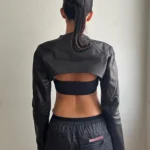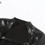 Jaqueta com comprimento extra curto e modelagem fina confeccionada em poliéster e elastano. Além disso a peça apresenta gola de suporte, fechamento em ponto aberto e mangas compridas em formato normal com espessura padrão. O modelo possui decoração em botões, acabamento sólido e design focado no estilo de moda urbana.