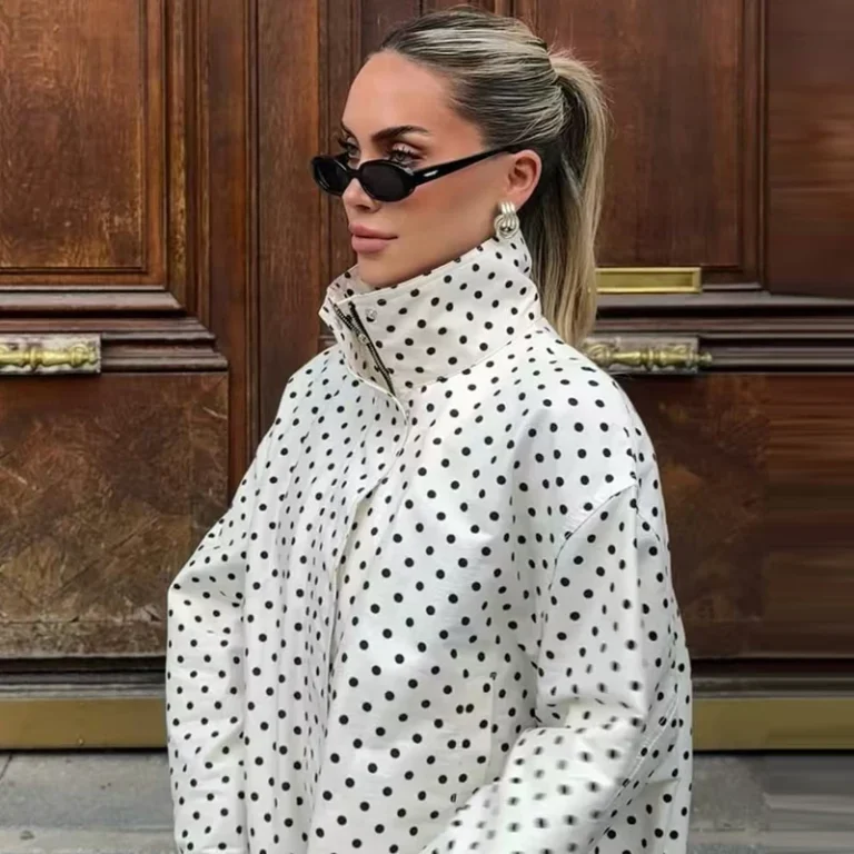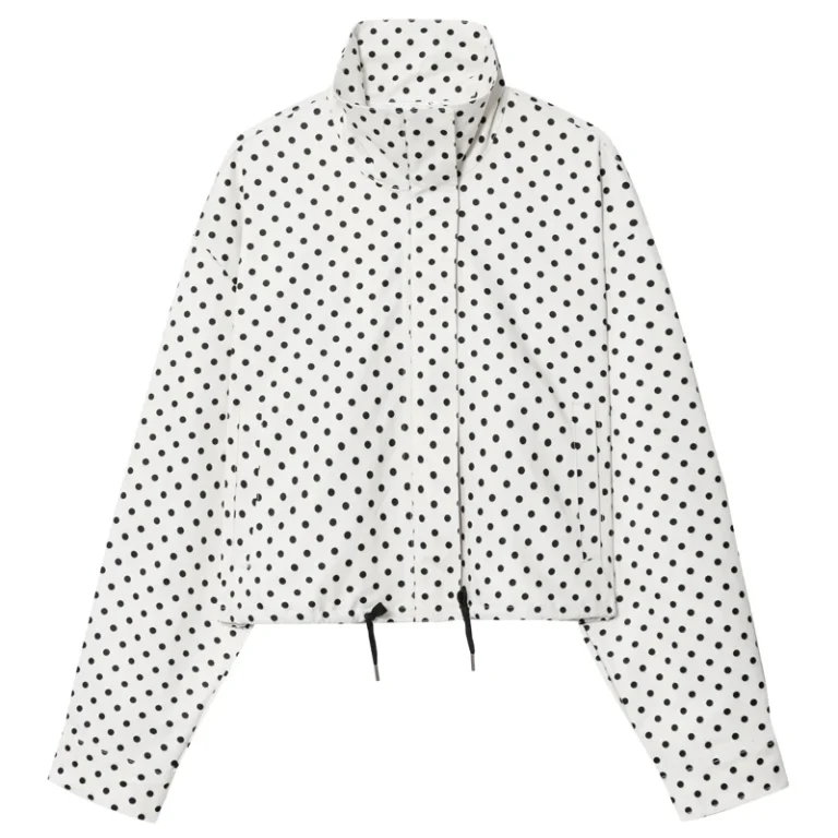 Jaqueta e/ou short com estampa de bolinhas e modelagem solta desenvolvida para ocasiões casuais. Conjunto sendo confeccionadas em poliéster com espessura padrão e apresenta fechamento frontal por zíper e gola alta.