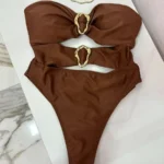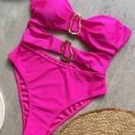 Este maiô de uma peça combina elegância e sensualidade com seu design bandeau, recortes estratégicos e anéis metálicos decorativos. O tecido firme e confortável realça a silhueta e oferece liberdade de movimento, ideal para piscina, praia e férias de verão.