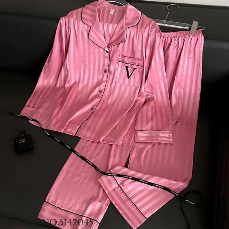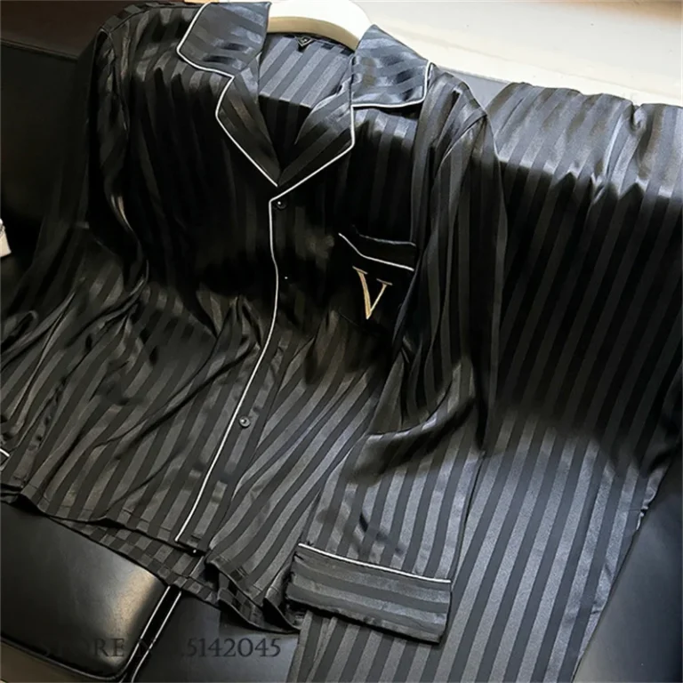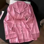 Conjunto de pijama feminino com proposta de luxo e design sofisticado ideal para momentos de descanso com conforto e elegância. Possui modelagem de comprimento total com decote em V e mangas longas que proporcionam um visual refinado e aconchegante. Confeccionado em poliéster com toque acetinado e acabamento listrado oferece sensação suave na pele aliando leveza e estilo para uso em casa.