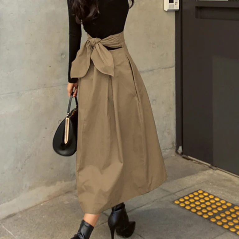 Saia longa de cintura alta com laço, modelagem A-line e caimento elegante, perfeita para looks casuais e sofisticados o ano todo.