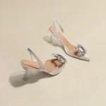 O uso do salto geométrico/estranho combinado com a transparência do PVC transforma este sapato em uma peça de destaque, ideal para quem deseja um visual de “sapatinho de cristal” moderno.