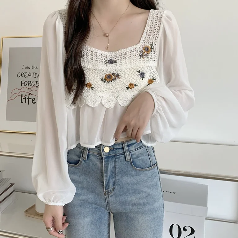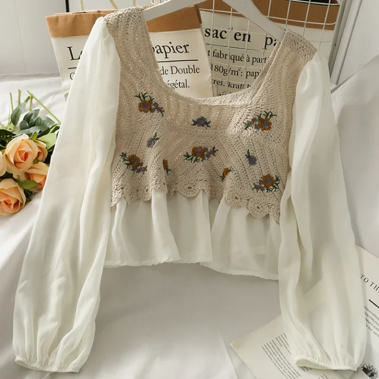 Um top boêmio com design romântico, combinando crochê e chiffon para um visual leve e encantador.