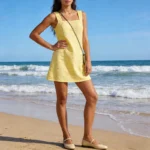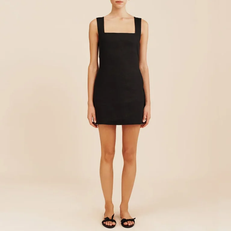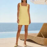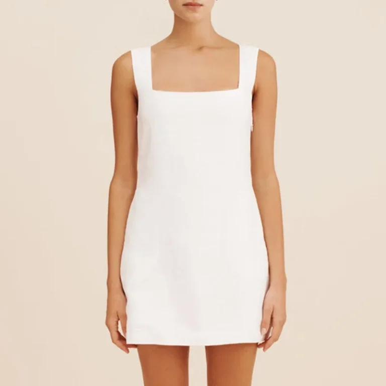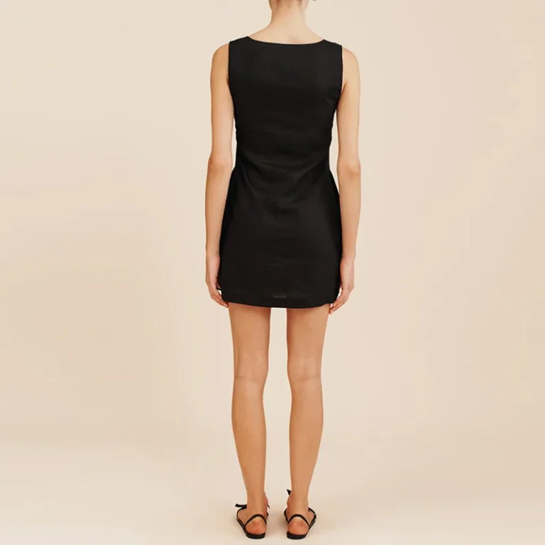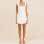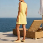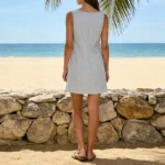 Vestido curto com silhueta linha A e decote gola O desenvolvido para um estilo clássico e atemporal. Além disso a peça apresenta comprimento mini acima do joelho, design sem mangas e o modelo é confeccionado em fibras naturais de algodão/linho.