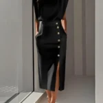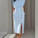 Vestido de comprimento médio da panturrilha com modelagem fina e silhueta lápis confeccionado em poliéster. Além disso a peça apresenta gola redonda, design sem mangas estilo tanque e cintura de caimento natural.