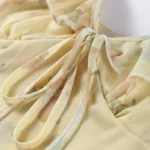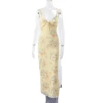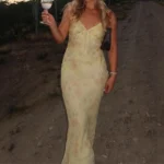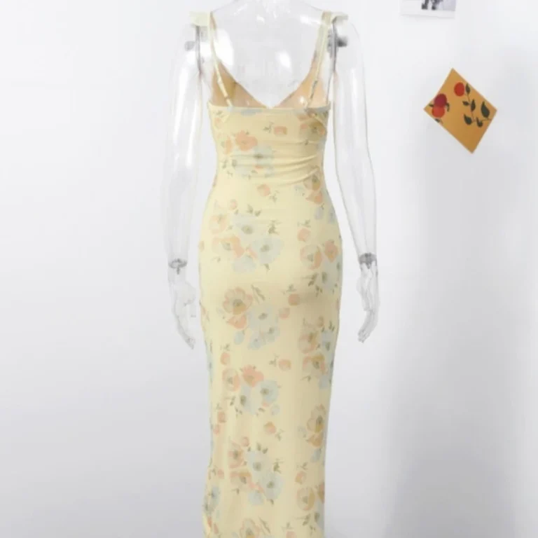 Vestido longo estampado com decote em V e alças de espaguete desenvolvido para uso em ambientes de praia e lazer. A peça apresenta silhueta bainha com cintura império, comprimento até o tornozelo e o modelo ainda possui fechamento por zíper e ajuste fino ao corpo com ligeiro estiramento.