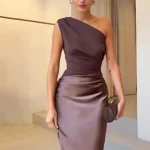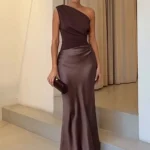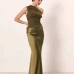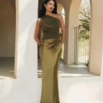 Vestido longo de estética sofisticada com design assimétrico e caimento elegante ideal para produções refinadas e ocasiões especiais.