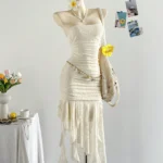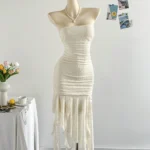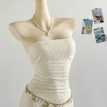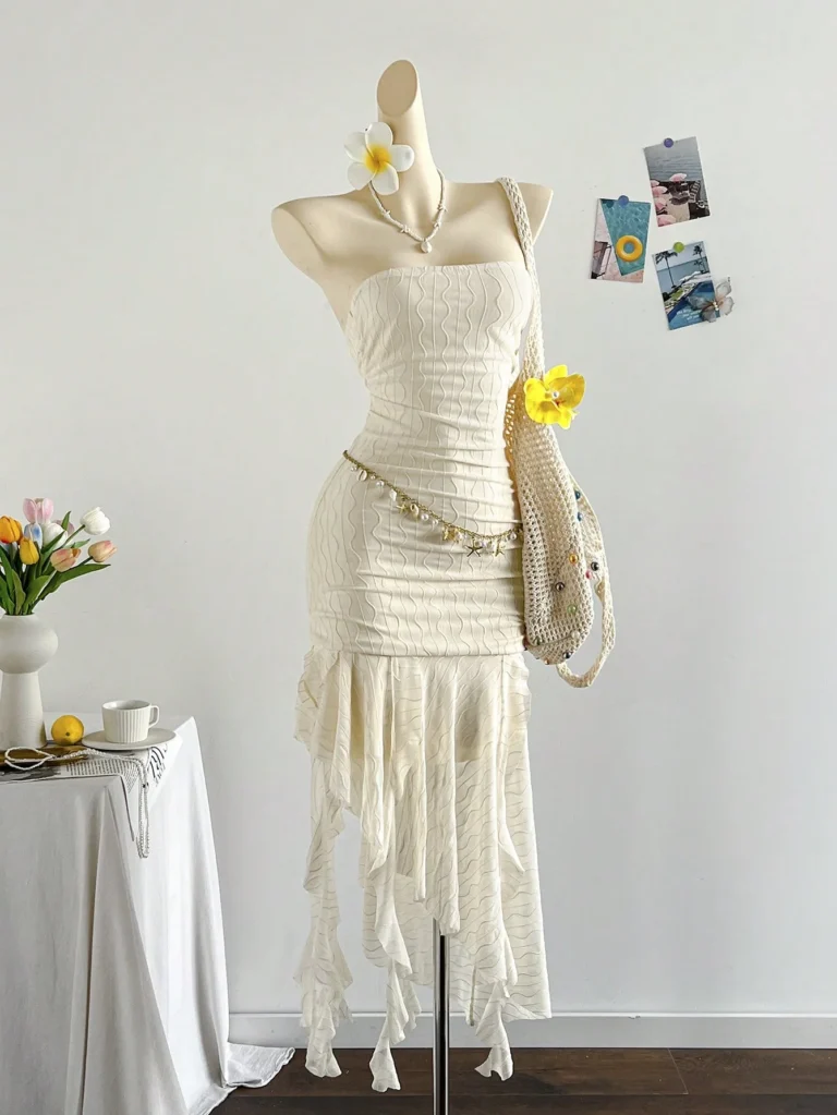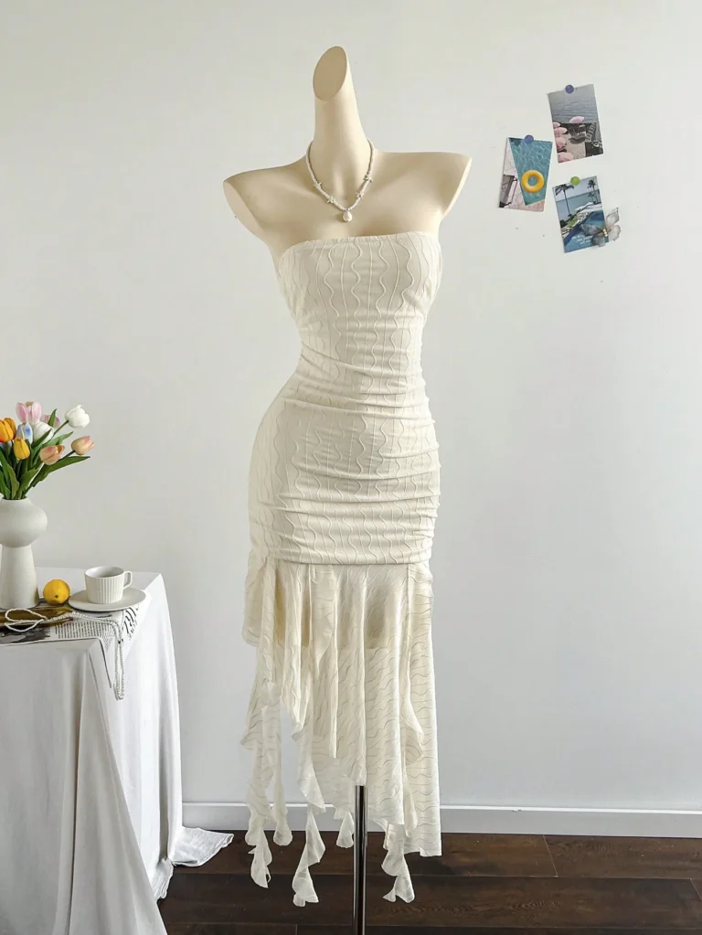 Vestido mini em estilo francês, uma peça delicada e moderna que se destaca pelo design tomara que caia e pela silhueta assimétrica. Ele é confeccionado em poliéster com técnica de tricô, o tecido oferece estiramento médio, garantindo um ajuste regulado que valoriza o corpo com conforto.