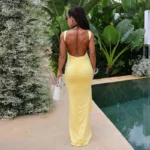 Vestido longo com silhueta bainha e decote gola O desenvolvido para uso versátil. A peça apresenta comprimento até o chão, design sem mangas com cintura natural e possui ajuste fino ao corpo com leve elasticidade e acabamento sólido.