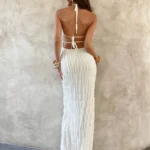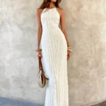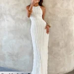 Vestido longo de silhueta sereia confeccionado em mistura de poliéster e elastano com leve elasticidade. A peça apresenta decote em gola O e o modelo possui comprimento até o tornozelo com padrão sólido.