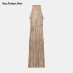 Vestido de visual sensual e elegante, com design clean que valoriza a silhueta de forma discreta. A modelagem ajustada e o comprimento longo criam um caimento sofisticado, ideal para um look marcante e feminino.