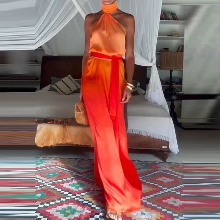Leve, elegante e perfeito para o verão, este vestido longo com estampa em degradê combina a sensualidade do decote halter com o charme boêmio da modelagem plissada. O design sem costas e o detalhe oco na cintura deixam o look ainda mais sexy, ideal para férias, praia, passeios tropicais ou festas ao ar livre. Além disso, a modelagem slim na parte superior e fluida no comprimento proporciona equilíbrio entre conforto e valorização da silhueta.