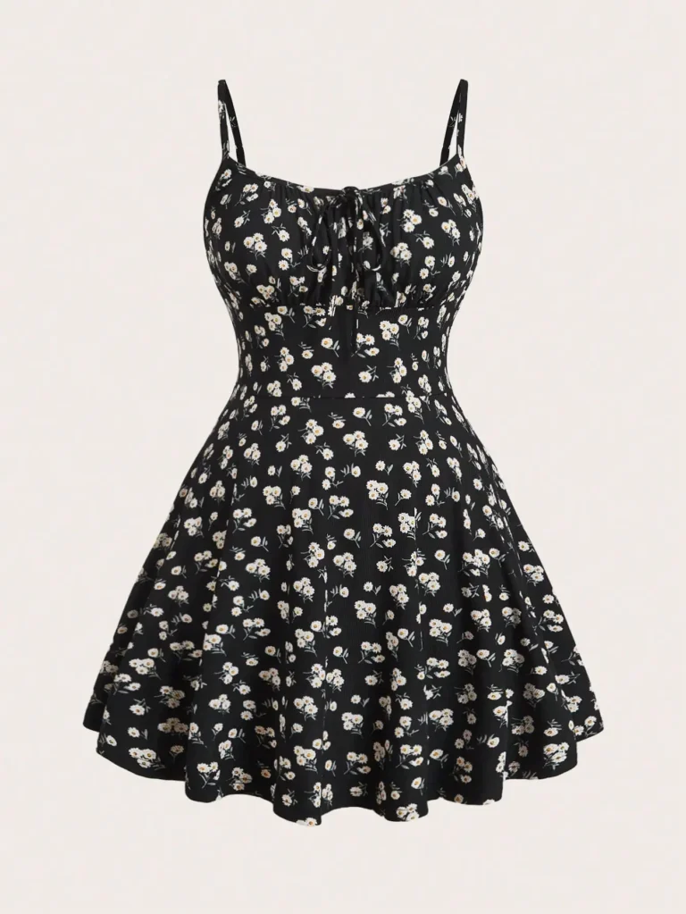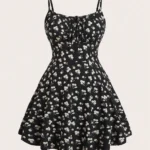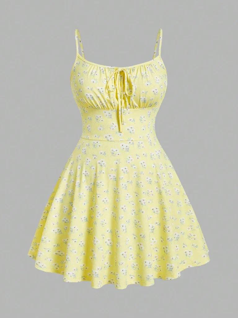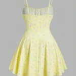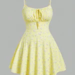 Vestido mini de silhueta linha A confeccionado em mistura de poliéster e elastano com leve elasticidade. A peça apresenta decote com corte no pescoço e possui padronagem floral e cintura natural com ajuste fino para uso casual.