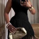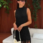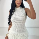 Vestido mini de modelagem justa confeccionado em tricô com alta elasticidade. A peça possui design sem mangas com gola redonda e cintura elástica para ajuste ao corpo.