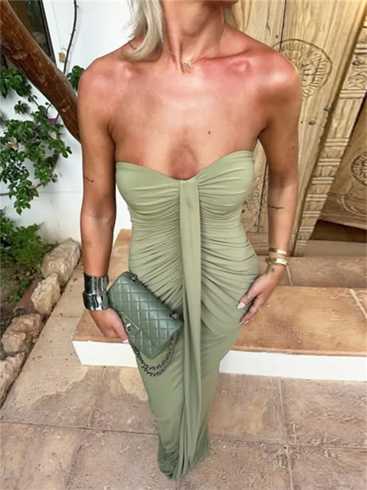Vestido longo de silhueta bainha confeccionado em mistura de poliéster e elastano. A peça apresenta design com decote sem alças e comprimento até o chão.