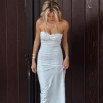 Vestido feminino longo sem mangas, com decote no peito, combinando elegância e conforto para looks casuais de primavera e verão.