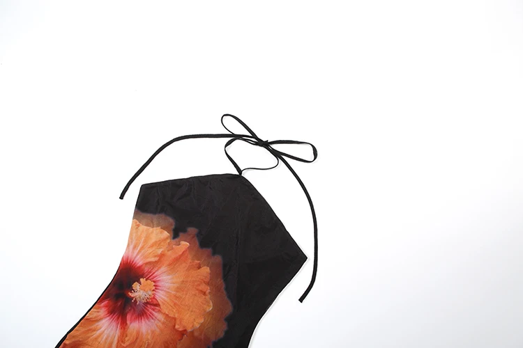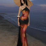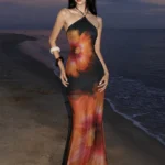 Vestido longo com silhueta linha A e decote desenvolvido para o estilo praia. Além disso a peça apresenta comprimento até o tornozelo com cintura natural, detalhe decorativo sem costas e o modelo possui alta elasticidade com ajuste fino ao corpo.