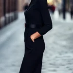 Vestido de comprimento na altura do joelho com modelagem de ajuste regulado e silhueta lápis confeccionado em poliéster. Além disso a peça apresenta gola meia alta e mangas em formato normal, destacando-se pela decoração com faixas.